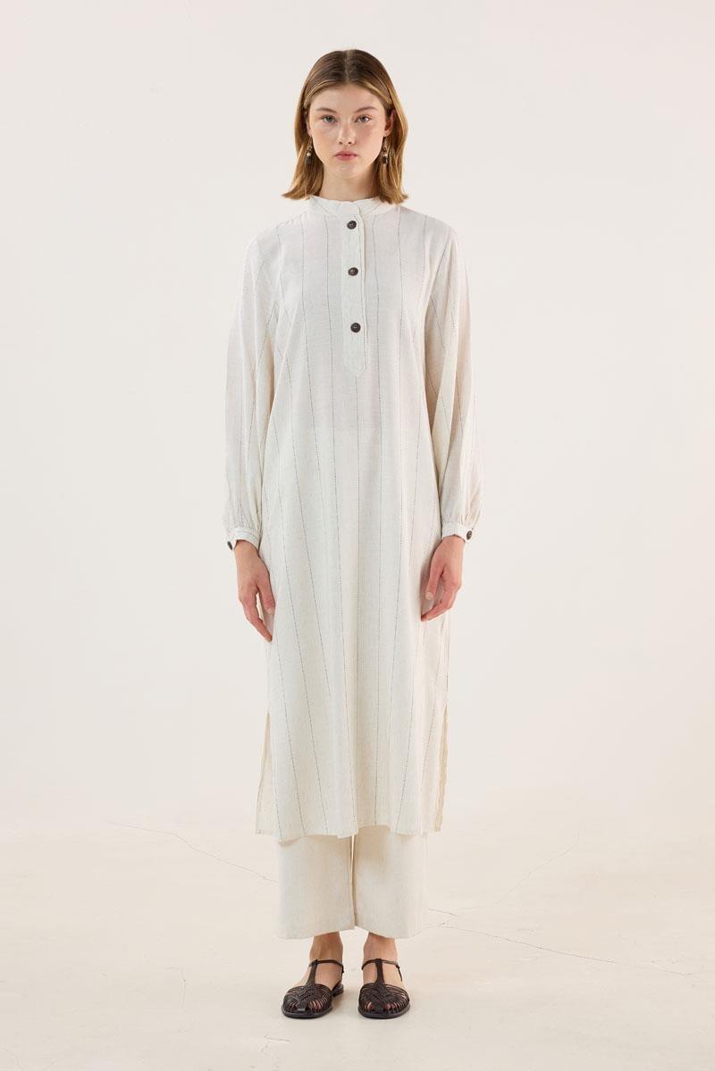 Ahşap Düğmeli Çizgili Tunik Ekru