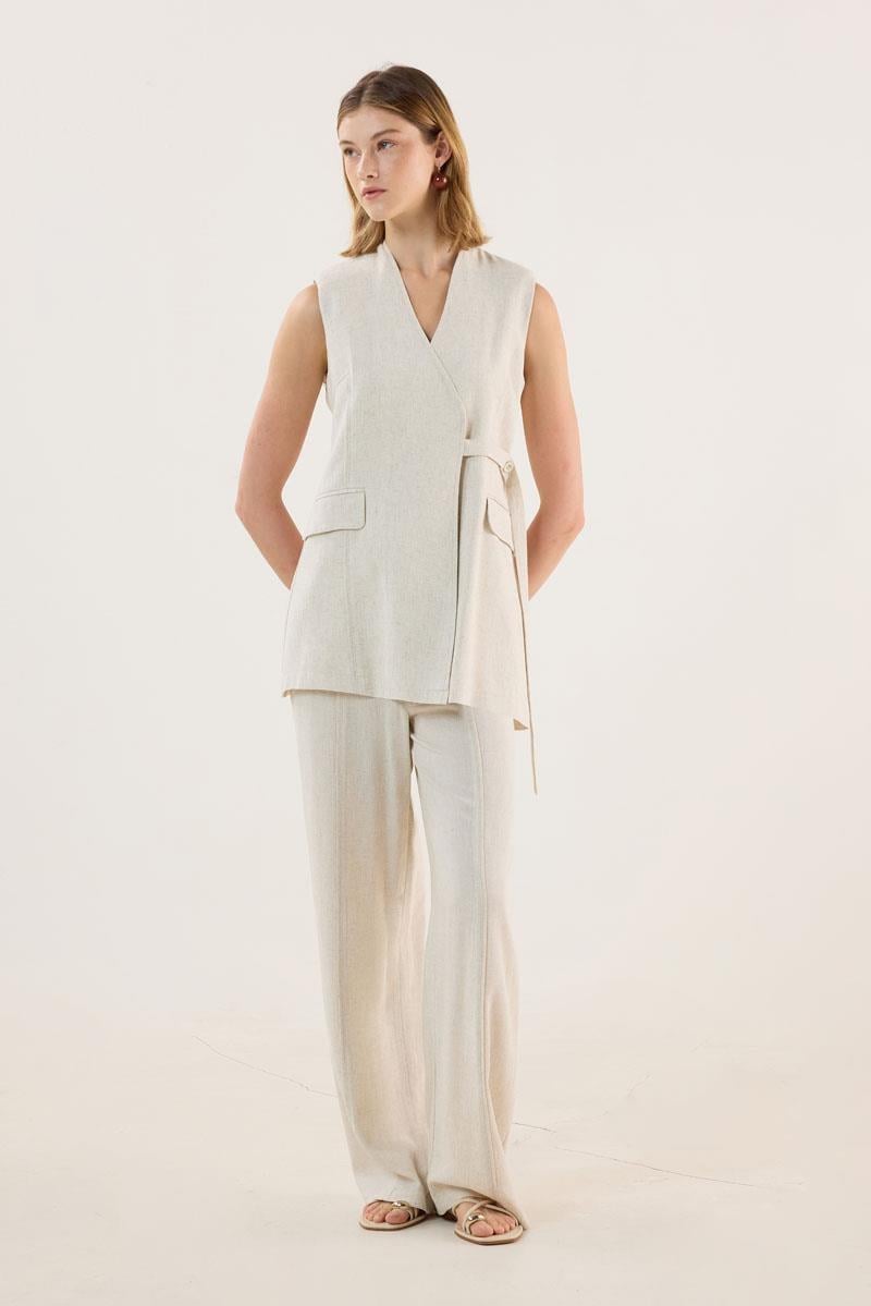 Kadın V Yaka Biye Detaylı Yelek Naturel