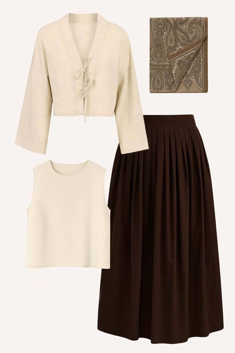 Ekru keten kimono hafif ve zarif bir katman sunarken, kolsuz bluz kombinin sade çizgisini destekliyor. Pileli eteğin hareketli formu feminen bir hava katıyor, etnik şal ise özgün ve karakterli bir tamamlayıcı oluyor. Günlük şıklığı özgür ruhlu bir yorumla buluşturan dengeli bir kombin.