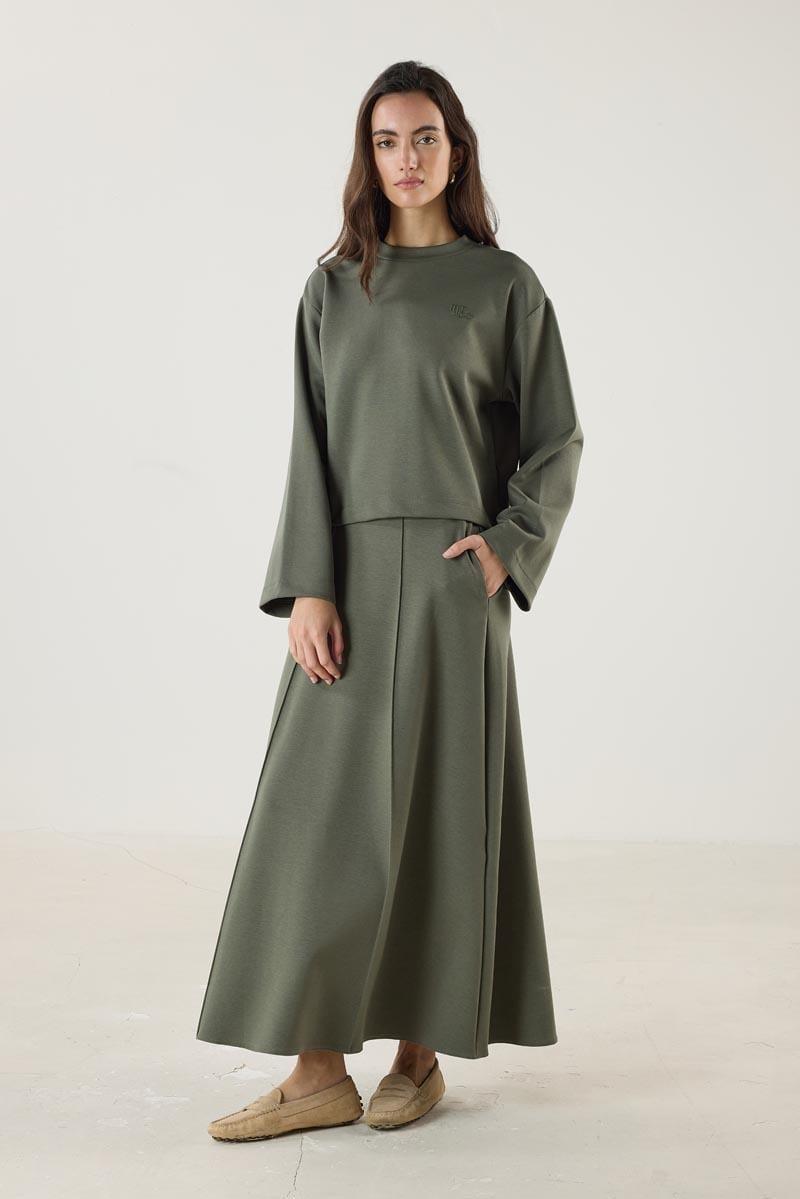 Haki Kısa Sweatshirt, Çan Kesim Etek Takım