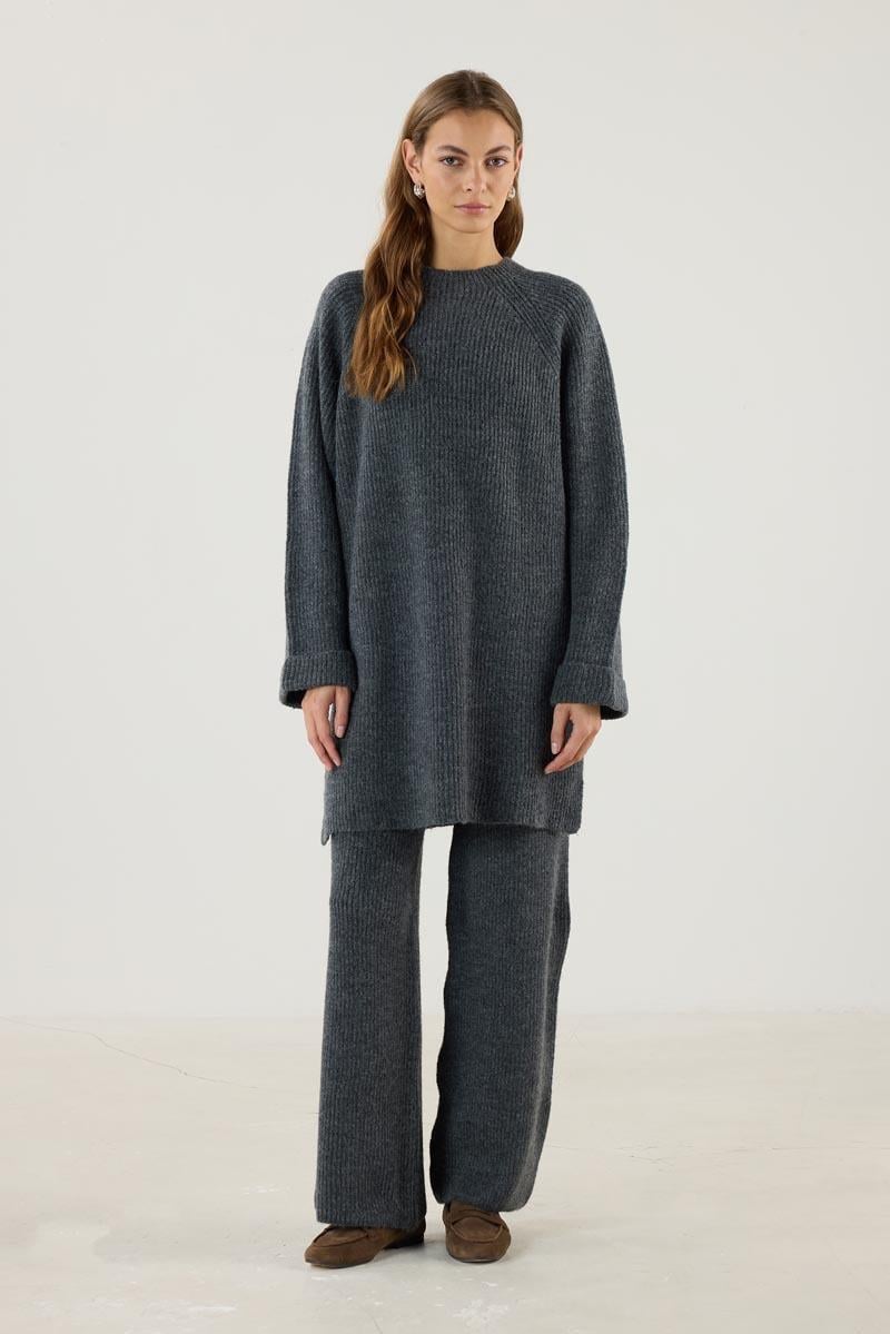 Kadın Bisiklet Yaka Duble Kollu Kalın Örme Triko Kazak Antrasit