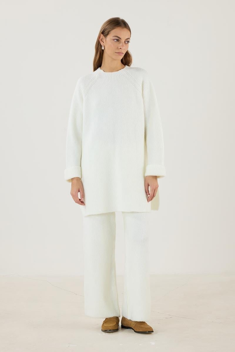 Kadın Bisiklet Yaka Duble Kollu Kalın Örme Triko Kazak Ekru