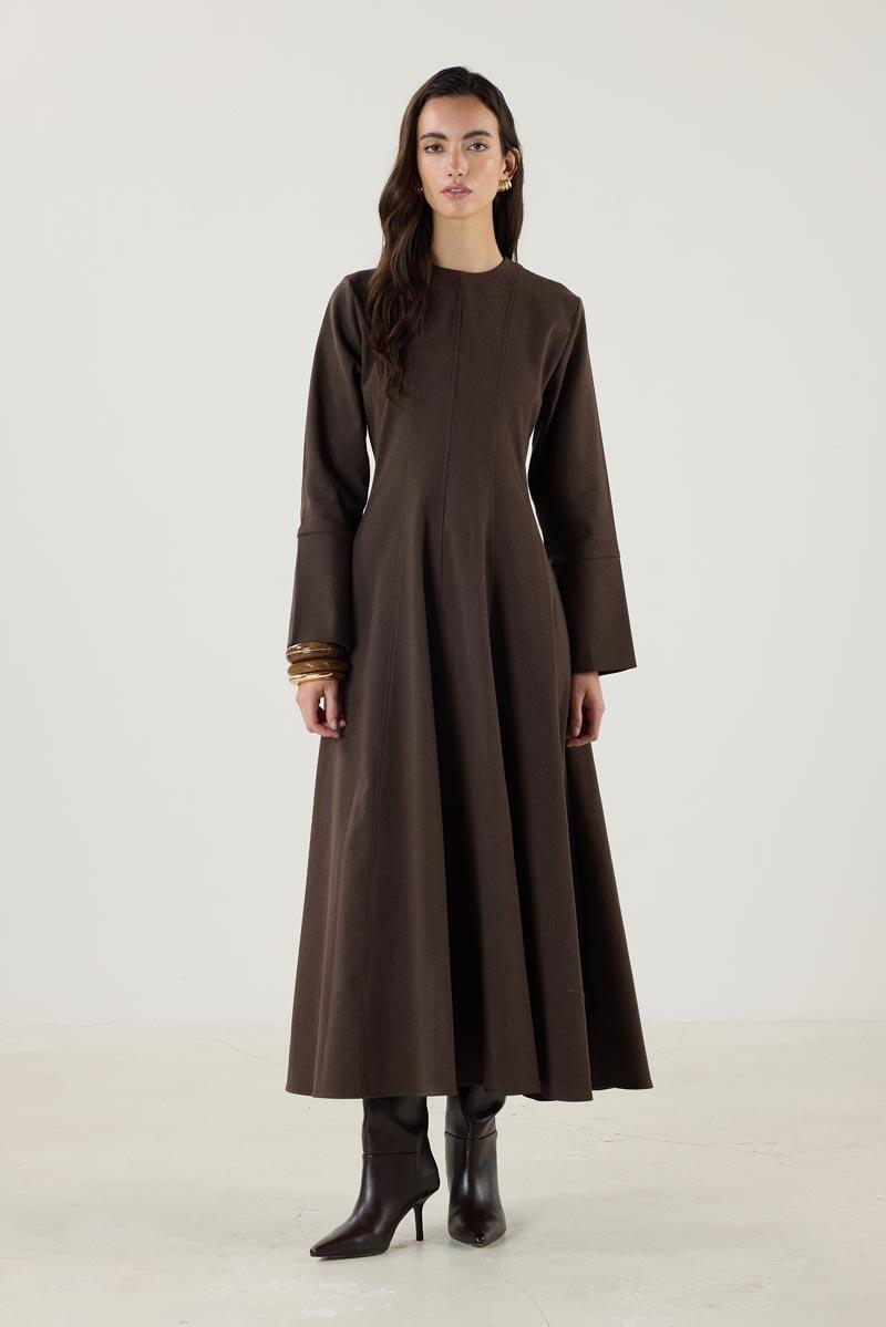 Kadın Bisiklet Yaka Uzun Kollu Geniş Manşetli Evaze Elbise Acı kahve