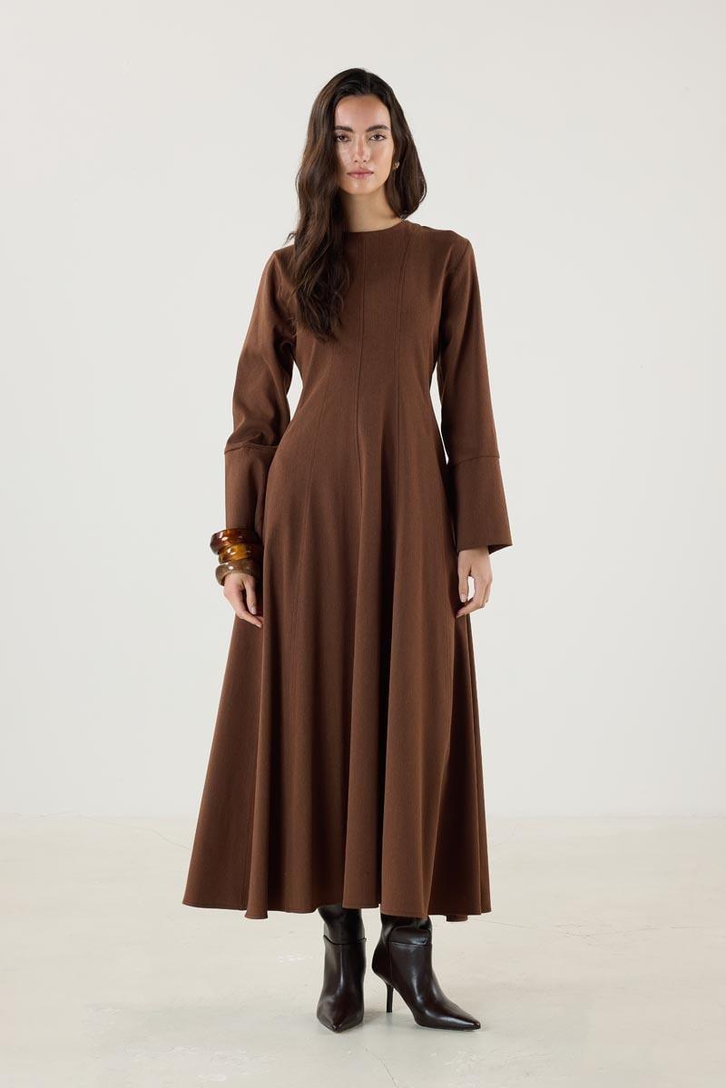 Kadın Bisiklet Yaka Uzun Kollu Geniş Manşetli Evaze Elbise Taba