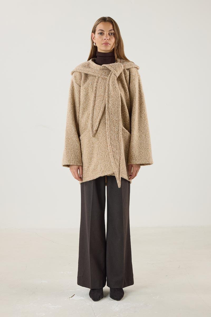 Kadın Bisiklet Yaka Uzun Kollu Seyyar Kapüşonlu Buklet Kaban Camel