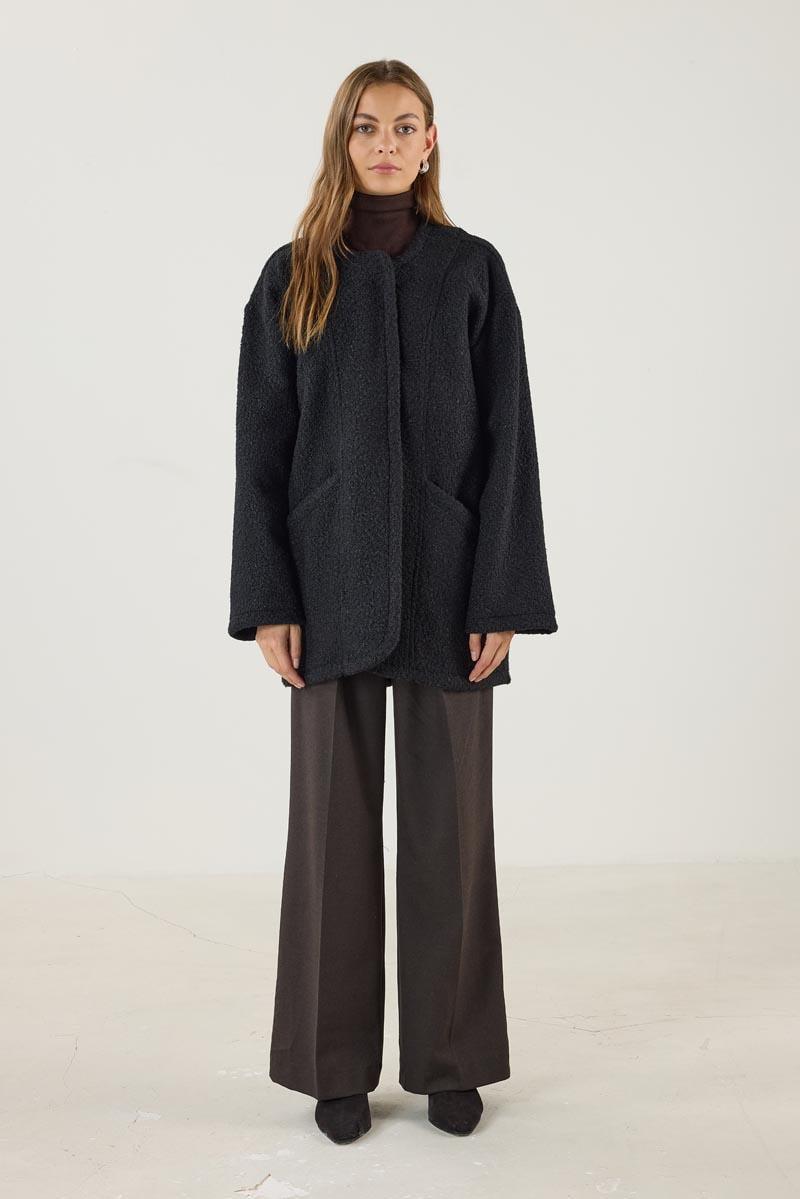 Kadın Bisiklet Yaka Uzun Kollu Seyyar Kapüşonlu Buklet Kaban Siyah