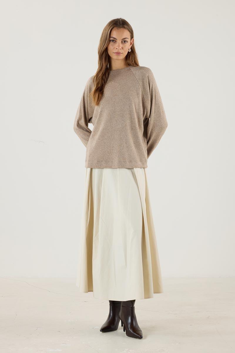 Kadın Bisiklet Yaka Uzun Kollu Yuvarlak Yaka Kısa Triko Bluz Vizon