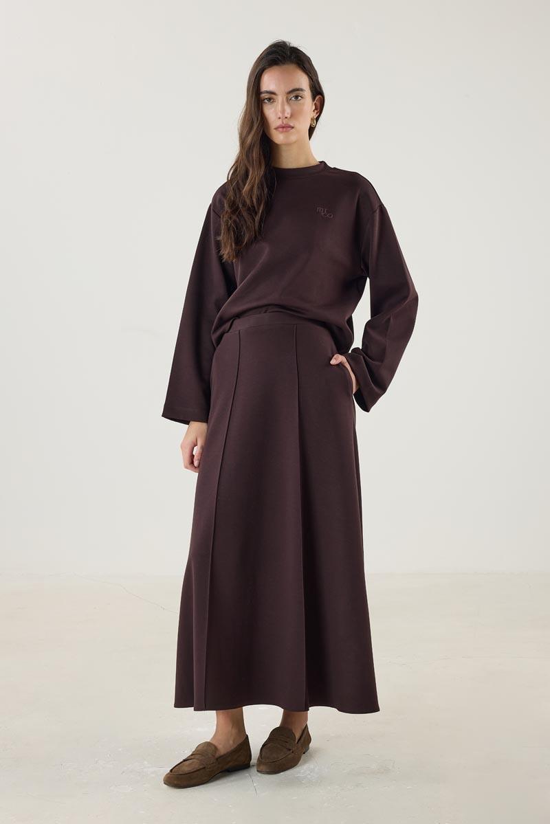 Kadın Dikiş Detaylı Çan Kesim Etek Acı kahve