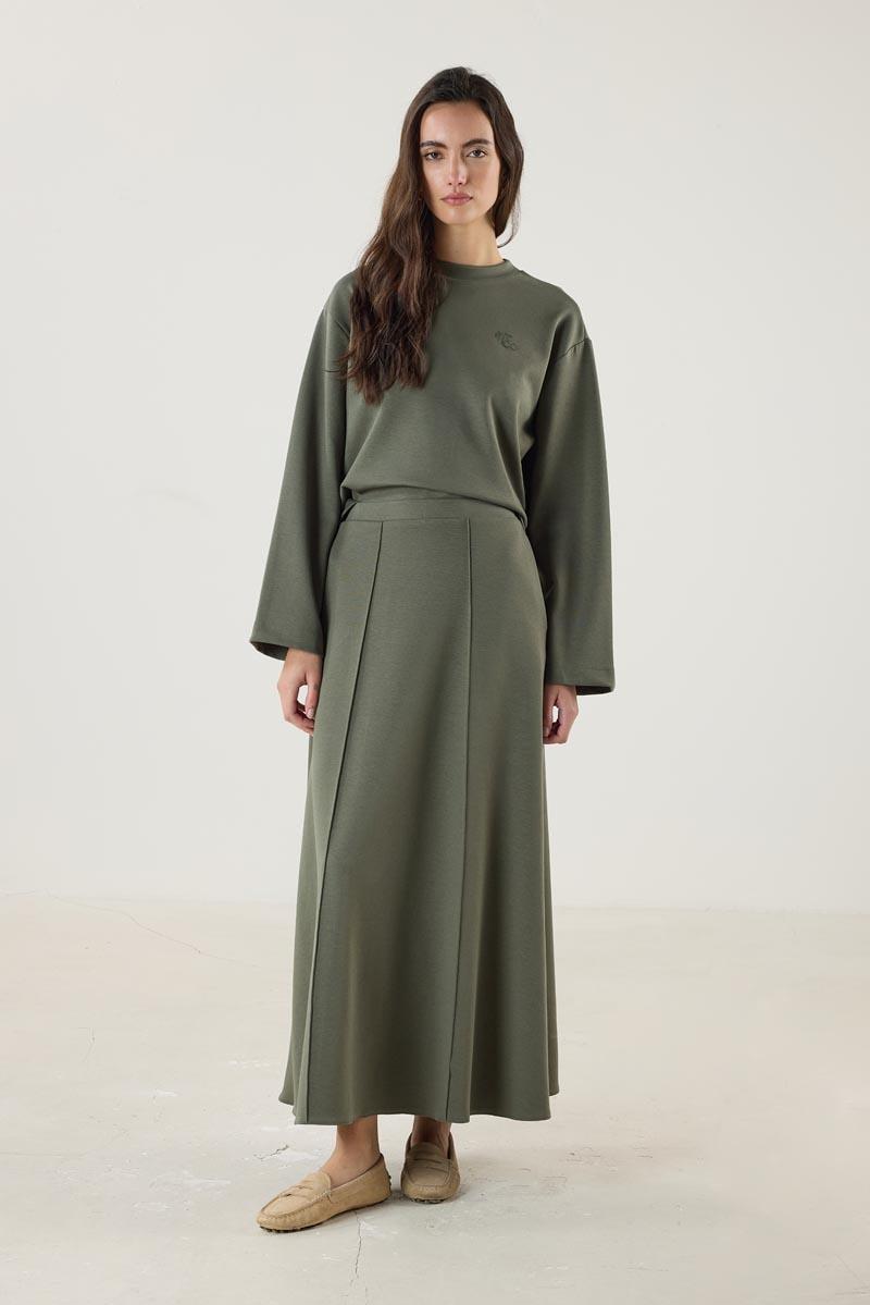 Kadın   Dikiş Detaylı Çan Kesim Etek Haki