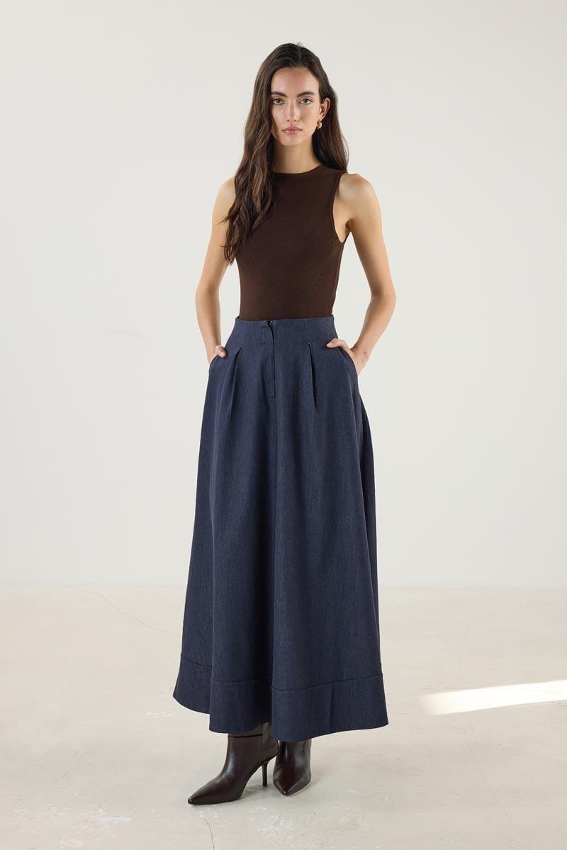 Kadın Etek Ucu Parçalı Kloş Kesim Kot Etek Lacivert