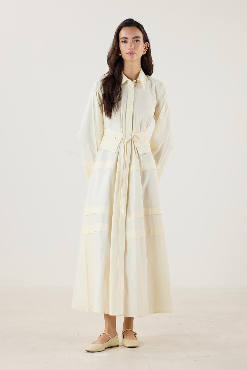 Kadın Gömlek Yaka Uzun Kollu Aller Detaylı %100 Pamuk Elbise Krem