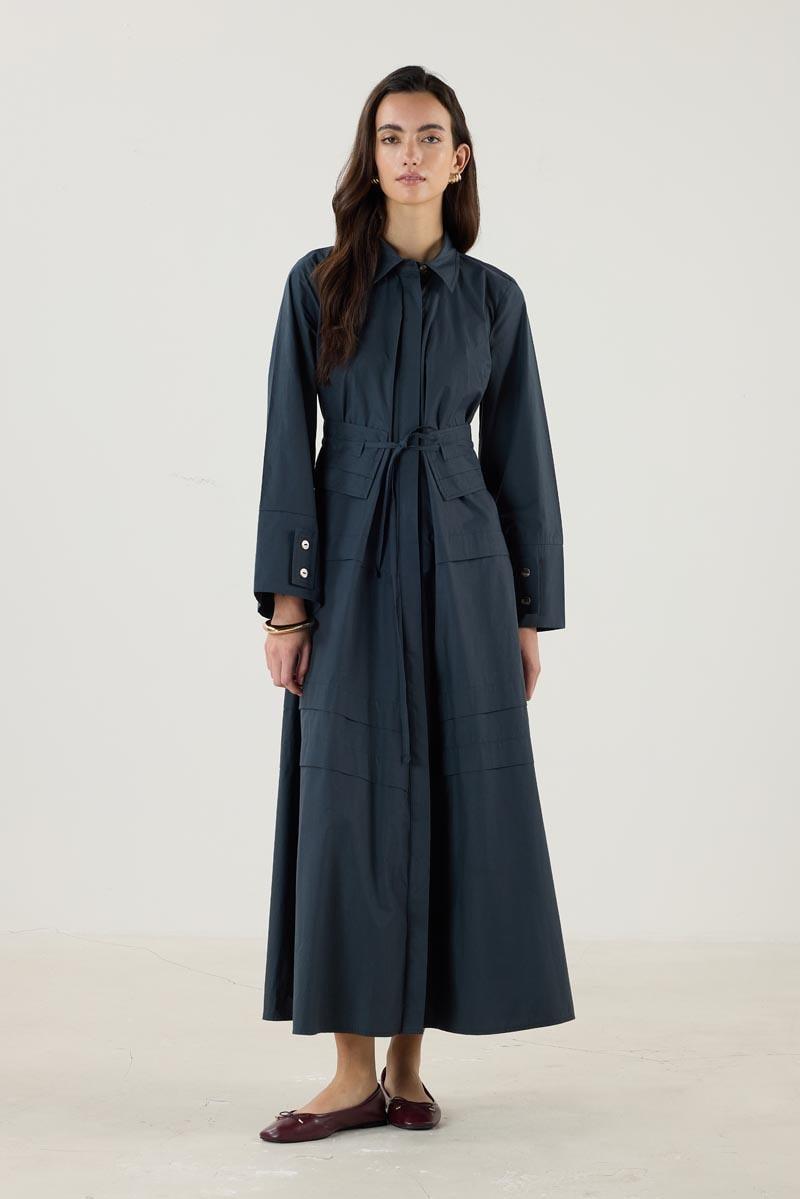 Kadın Gömlek Yaka Uzun Kollu Aller Detaylı %100 Pamuk Elbise Lacivert