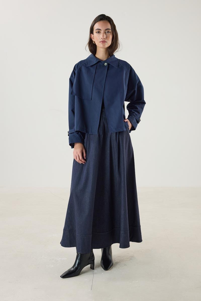 Kadın Gömlek Yaka Uzun Kollu Kemerli Cepli Kısa Trençkot Lacivert