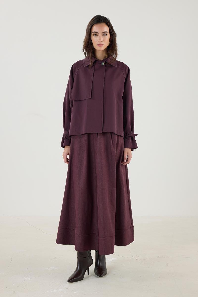 Kadın Gömlek Yaka Uzun Kollu Kemerli Cepli Kısa Trençkot Mürdüm