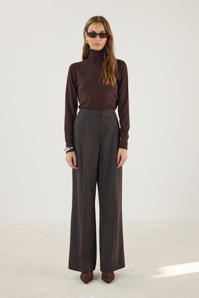 Kadın Yüksek Bel Pileli Palazzo Pantolon Acı kahve