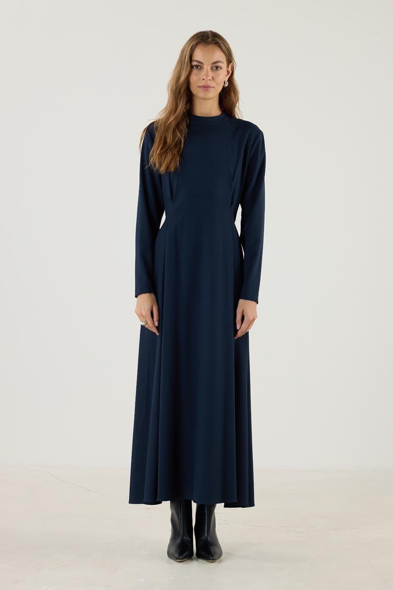 Kadın Yüksek Yaka Uzun Kollu Çift Pileli Yüksek Yaka Elbise Lacivert