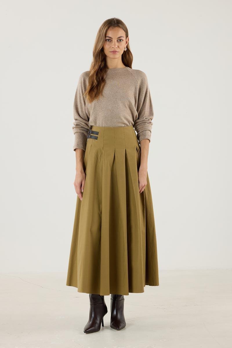 Kemer Aksesuarlı Pileli Etek Zeytin Yeşili