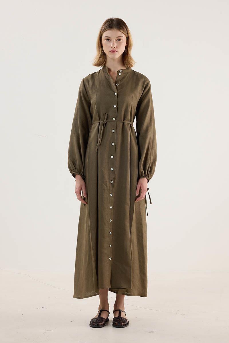 Kolları Bağcıklı Hakim Yaka %100 Keten Elbise Haki