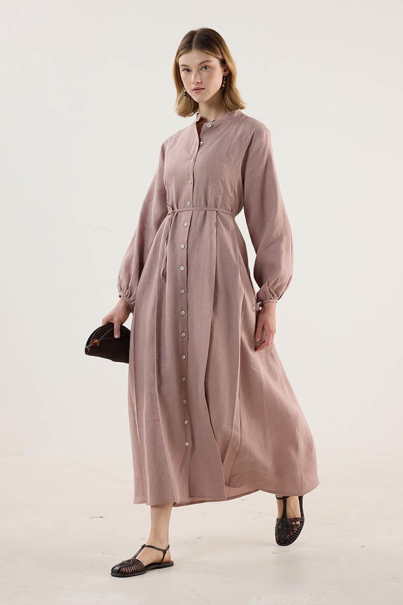 Kolları Bağcıklı Hakim Yaka %100 Keten Elbise Pudra