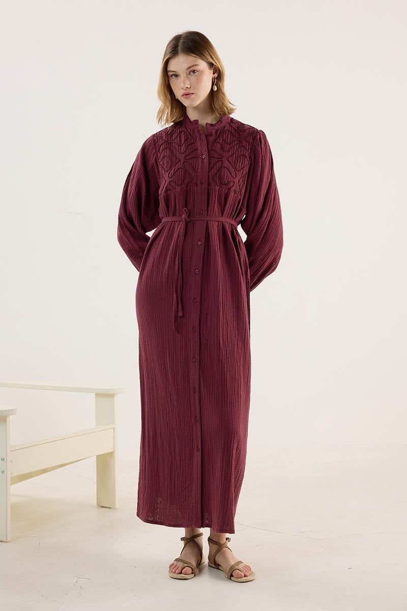 Kadın Hakim Yaka Nakışlı Müslin Elbise Bordo