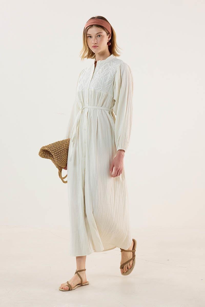 Kadın Hakim Yaka Nakışlı Müslin Elbise Ekru