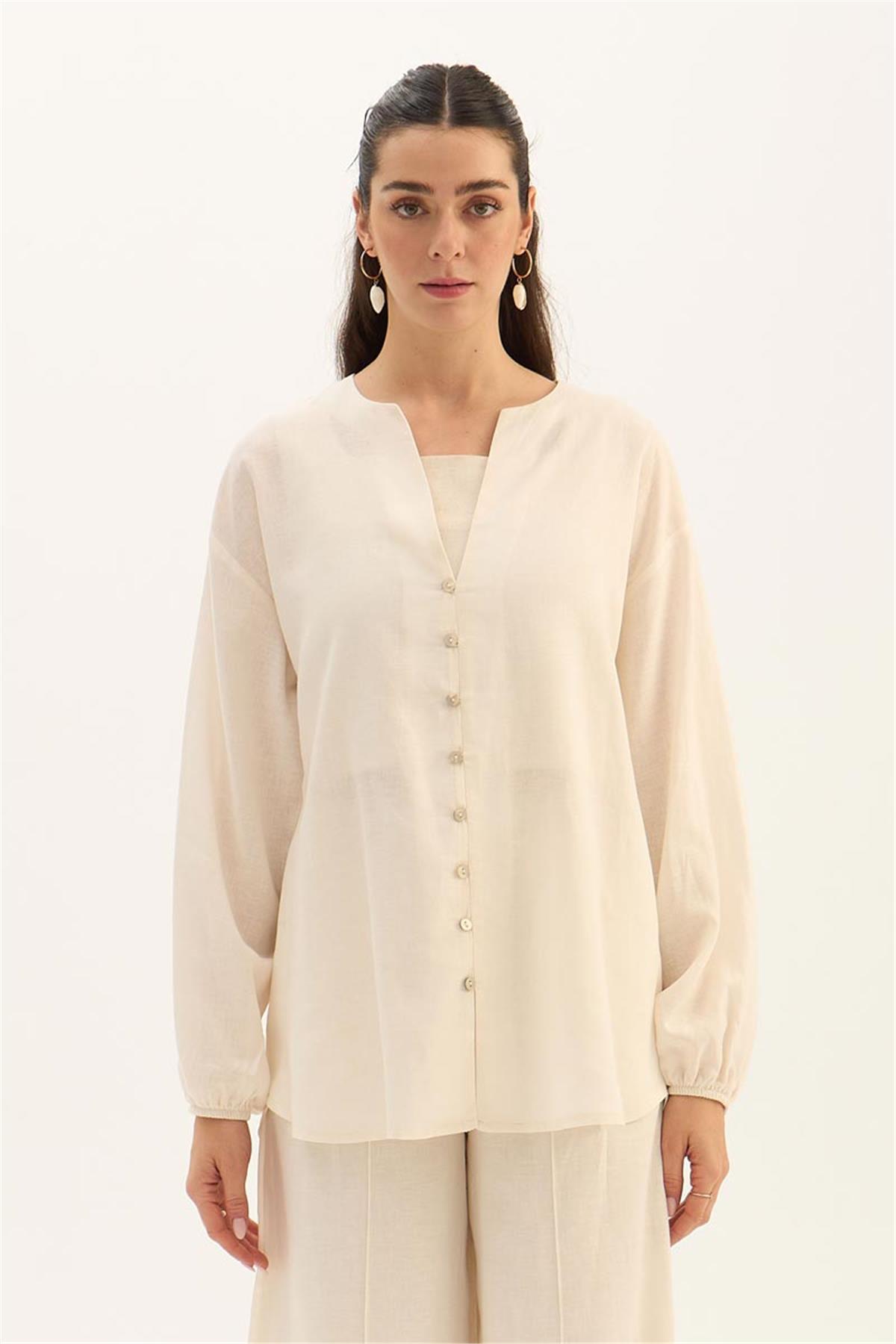 Kadın V Yaka Sedef Düğmeli Bluz Ekru