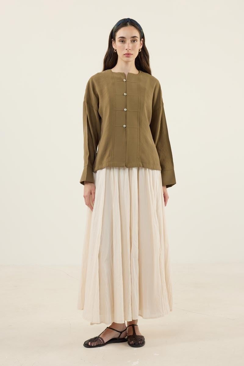 Sedef Düğmeli Modal Bluz Zeytin Yeşili, yumuşak modal dokusu ve modern tasarımıyla yaz gardırobuna zamansız bir şıklık katıyor. %85 modal ve %15 polyester karışımı kumaşı, hafif ve nefes alabilen yapısıyla gün boyu konfor sağlarken, normal kalıbı rahat bir kullanım sunar. Bisiklet yaka formu, düşük omuz detayı ve sedef parlaklığındaki düğmeler, tasarıma zarif bir ışıltı kazandırır.