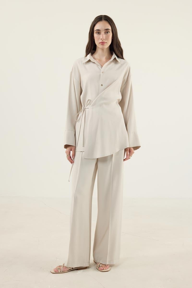 Tensel Palazzo Pantolon Taş, yaz mevsimine uygun hafif ve dökümlü yapısıyla konforlu bir kullanım sunar. %45 tensel, %47 viskon ve %8 polyester karışımı kumaşıyla nefes alabilir bir yapıdadır. Bol paça formu, zarif duruşu ve cepli tasarımıyla hem günlük hem de şık kombinlerde kullanılabilir.