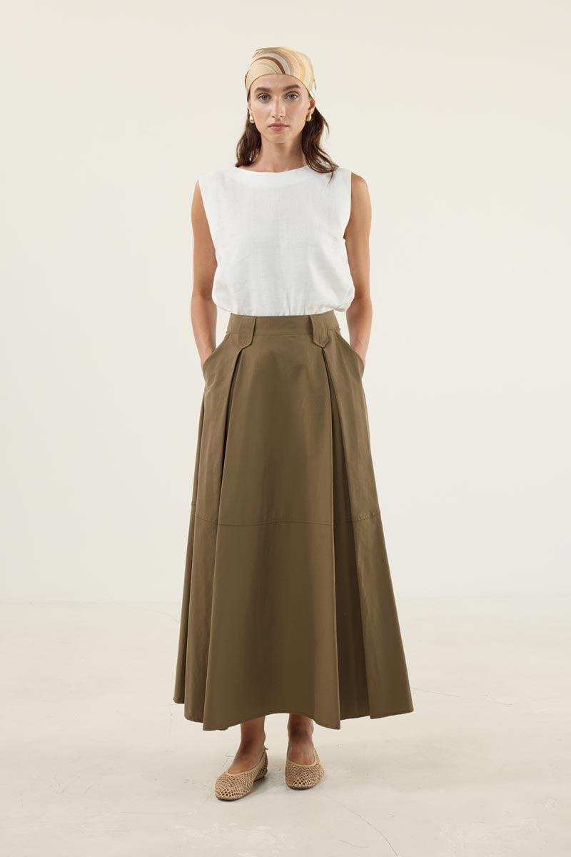 Zeytin yeşili tonu, hem doğal hem de şehirli bir görünüm sunarak farklı renklerle kolayca kombinlenebilir. Basic tişörtlerden gömleklere kadar birçok üst parçayla uyum sağlayan bu etek, yaz gardırobunuzun hem şık hem de pratik parçalarından biri olmaya aday.
