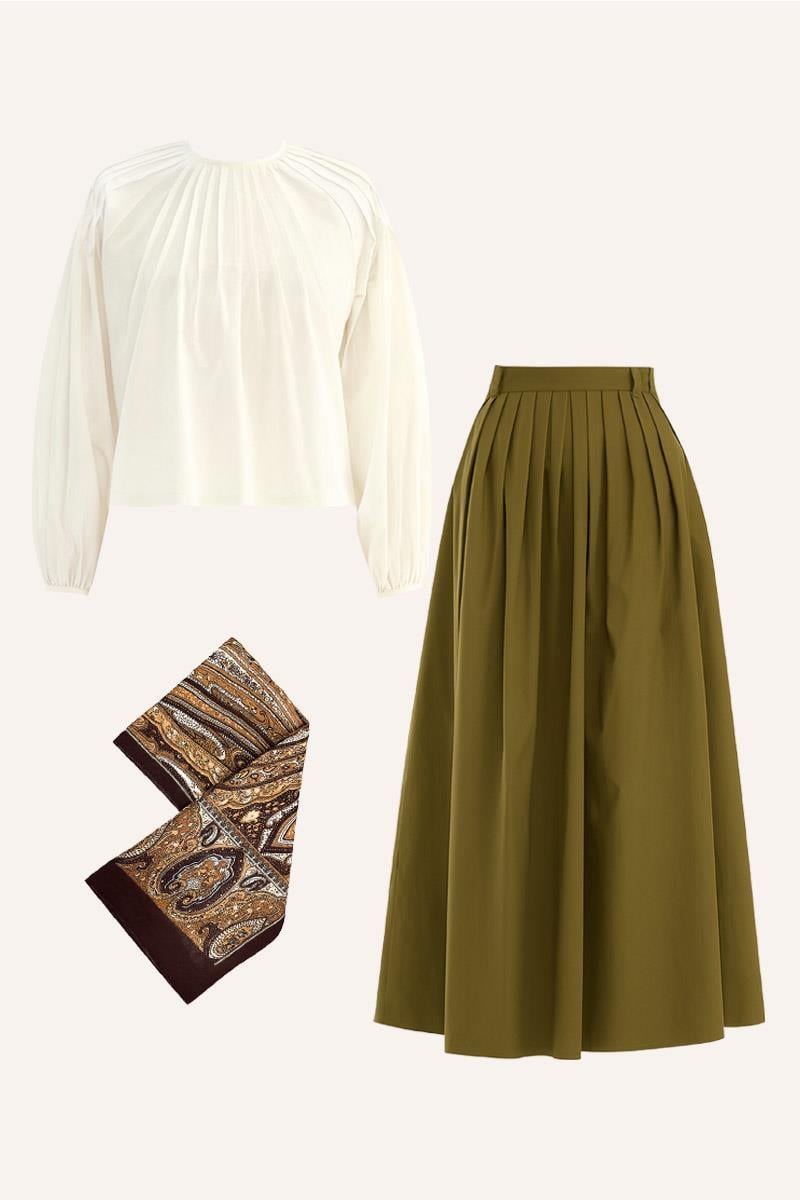 Zeytin Yeşili Pileli Etek, Ekru Bluz, Etnik Şal Kombin