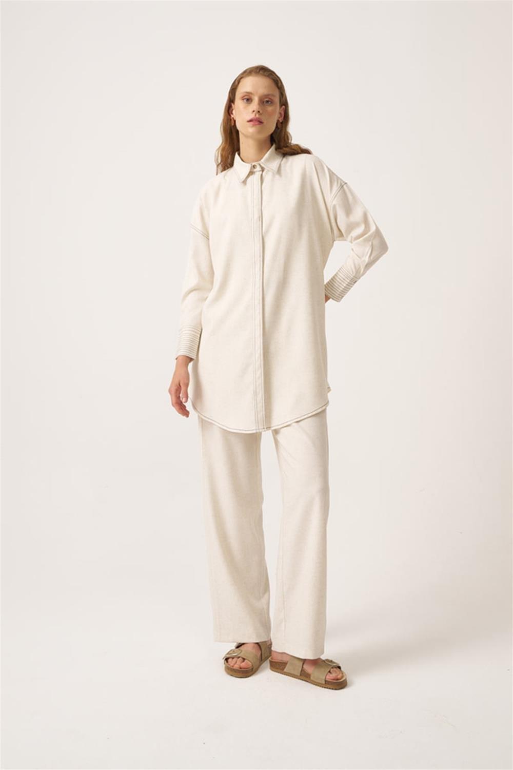 Ekru Manşeti Dikişli Gömlek, Lastikli Keten Pantolon Takım