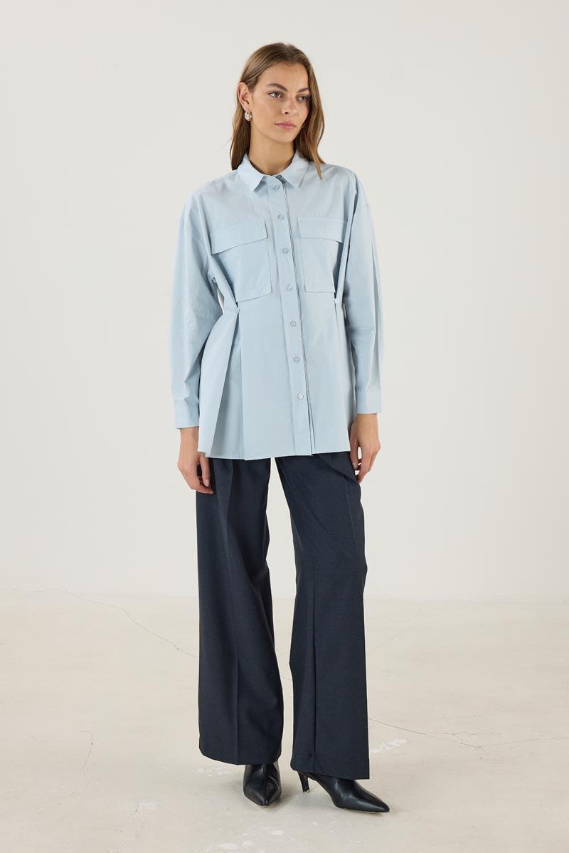 Kadın Gömlek Yaka Belden Düğmeli Pamuk Gömlek Buz Mavisi