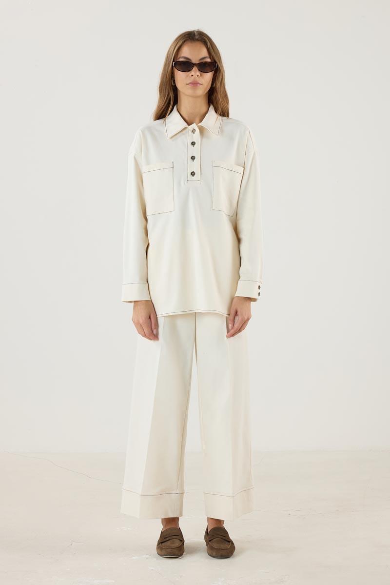 Kadın Gömlek Yaka Uzun Kollu Cepli Kot Gömlek Ekru