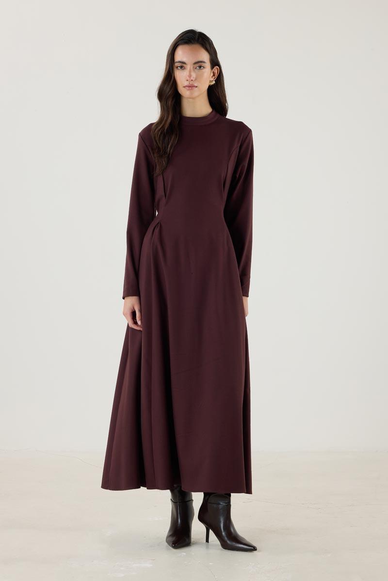 Kadın Yüksek Yaka Uzun Kollu Çift Pileli Yüksek Yaka Elbise Mürdüm