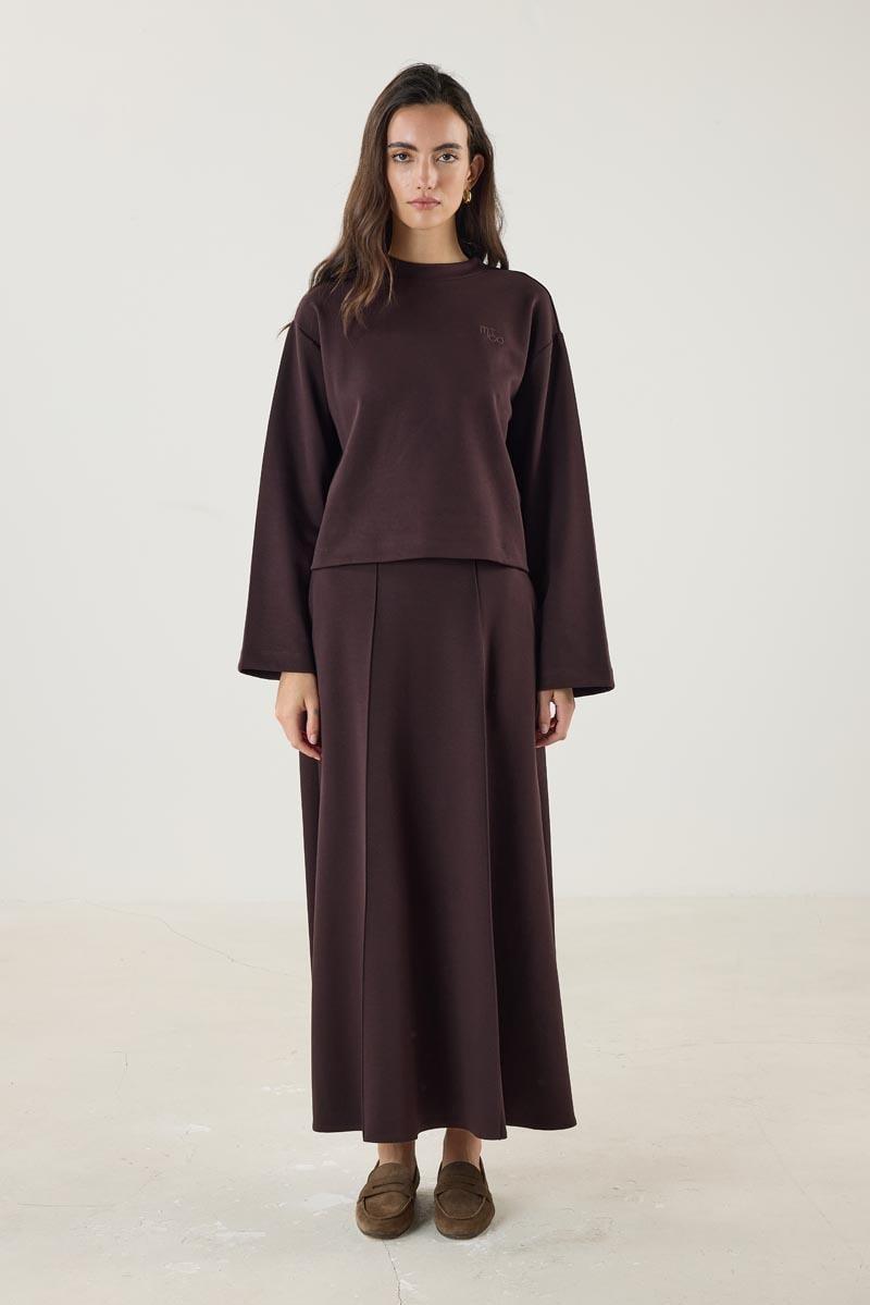 Kadın Yuvarlak Yaka Uzun Kollu Yuvarlak Yaka Nakış Detaylı Kısa Sweatshirt Acı kahve