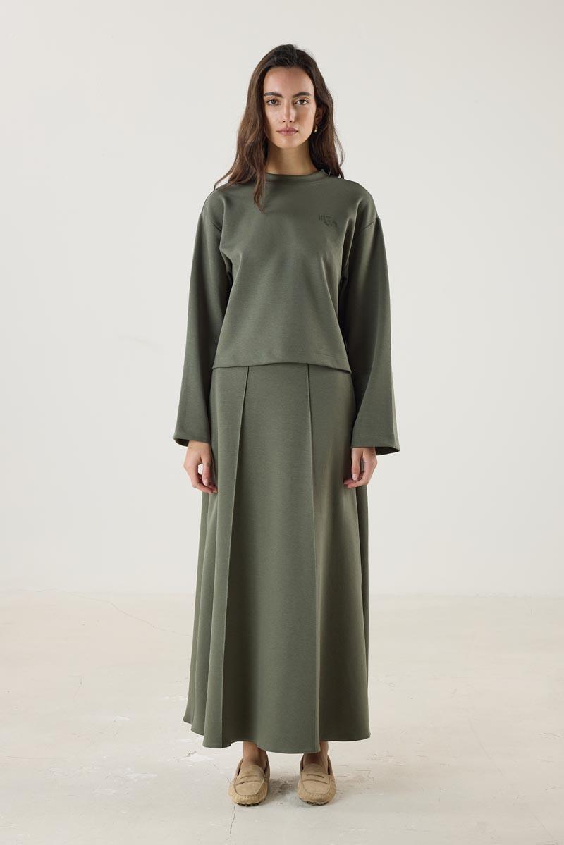 Kadın Yuvarlak Yaka Uzun Kollu Yuvarlak Yaka Nakış Detaylı Kısa Sweatshirt Haki