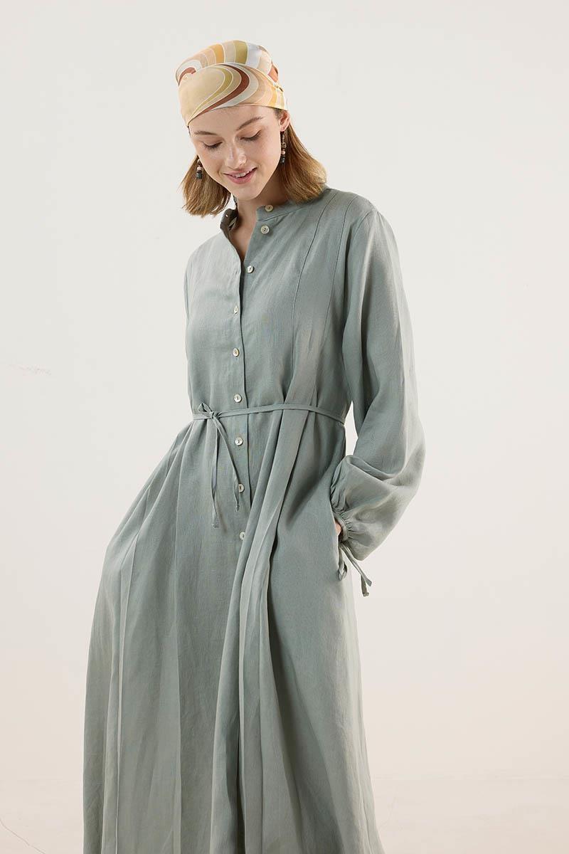 Kolları Bağcıklı Hakim Yaka %100 Keten Elbise Su Yeşili