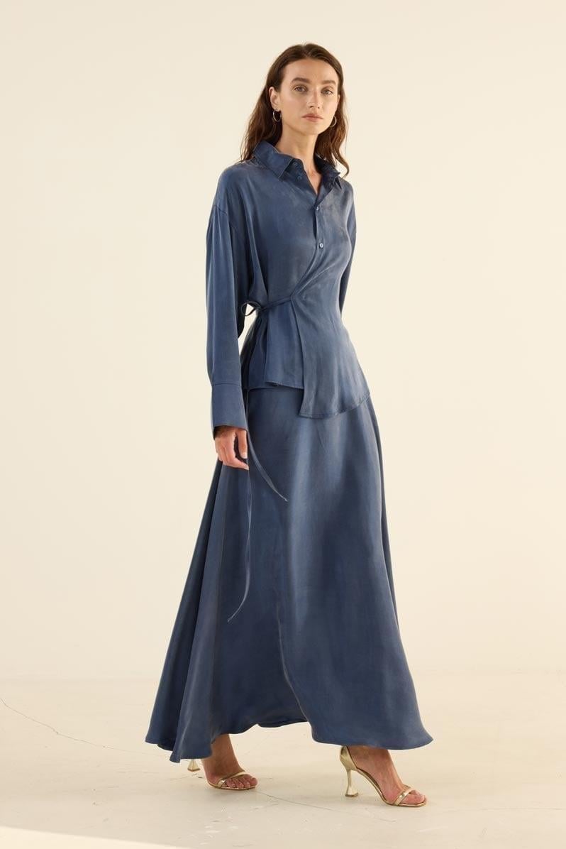 Lacivert Kupra İpek Gömlek, Etek Takım