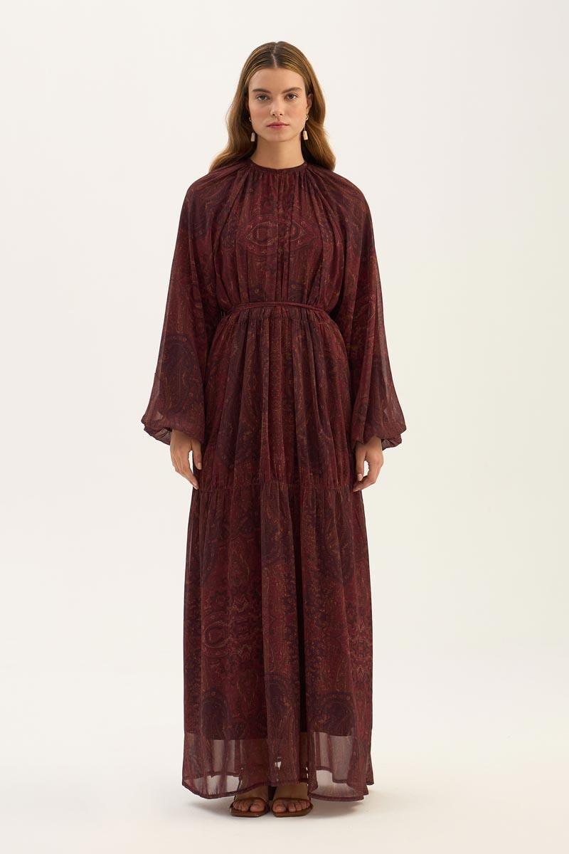 Kadın Yuvarlak Yaka Üç Katlı Şifon Elbise Koyu Bordo