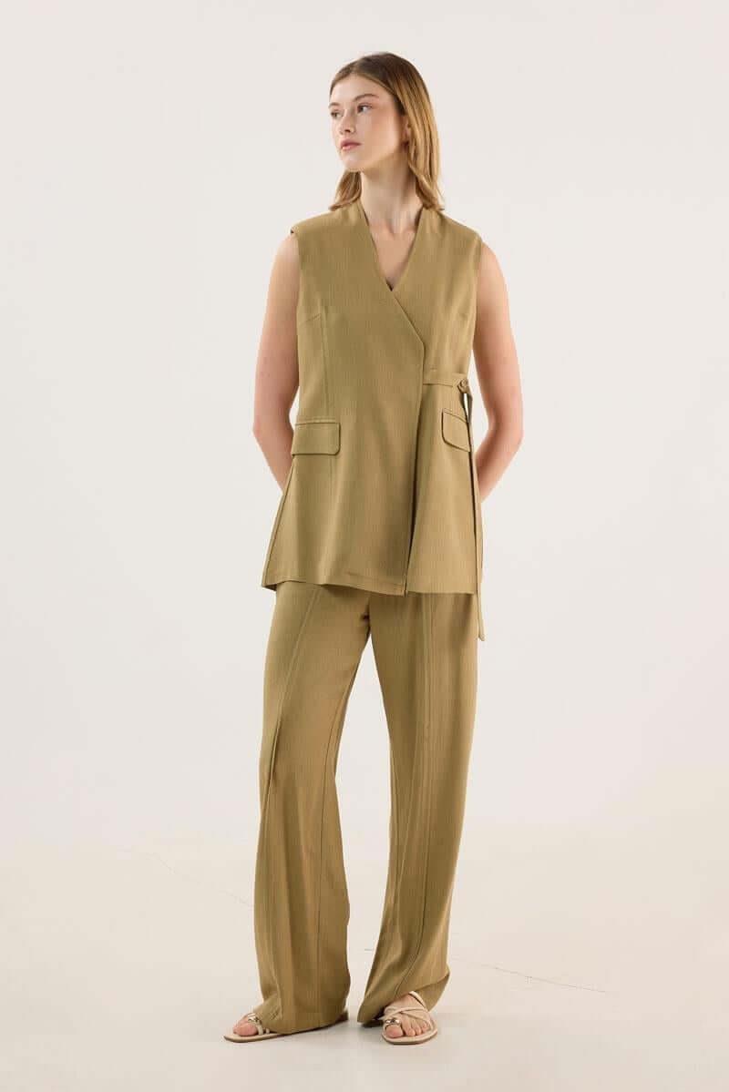 Yağ Yeşili Biye Detaylı Yelek, Pantolon Takım